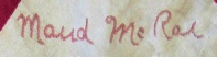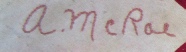 Although it is possible that the A McRae signature was signed for one of the two children of Roderick and Mabel McRae , Annie Jane "Evelyn" or Edmond "Alexander", it is unlikely that it was for Annie as she was always referred to as Evelyn in the records. Edmond went by the name Alexander and so he is a more viable candidate. Although only four years old in 1918, the name of a five year old relative, Eileen Shaver, was almost definitely signed on the quilt. However, Eileen was signed near the name of her mother, as were the names of Roderick and Mabel McRae. The A McRae name was signed in a totally different area of the quilt, suggesting that it was not part of this group. Thus it seems most likely that Duncan "Arthur" McRae or some other unidentified person was the A McRae signer.