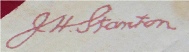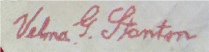 It is believed that the J H Stanton and Velma G Stanton signatures on the quilt were signed by James and Velma. There have been several cases where women used their maiden surname initial as their middle initial. The names were signed directly under one another which suggested that the signers were related. Velma and Stanton are fairly uncommon names, so it is speculated that the couple were travelling though Saskatoon or had some reason to be in Saskatoon during the time the quilt was being made. As they were Methodist, they may have been in Saskatoon on a Sunday and decided to go to church at 3rd Ave Methodist. No other candidates could be found for these signatures.