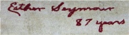 t is believed that Charles' mother, Esther Elizabeth Seaver, who was born on 11 August 1832 in Switzerland, Indiana to Joseph Seaver (1805-1885) and Sarah Dodge (1813-1892) was the person who signed the quilt Esther Seymour 87years. She married Daniel Thomas Seymour on 17 November 1852 in Rock Island, Illinois. Daniel was born on 30 June 1831 in Switzerland, Indiana to Hezekiah Seymour (1794-1858) and Mary Bennett (1795-1841). Esther died on 12 June 1923 in Culver City, Los Angeles, California and Daniel on 10 February 1894 in Taylor Ridge, Rock Island, Illinois.