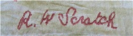 Although the middle initial on the quilt appears to be a W, it is believed that the signature belonged to Roy Meridith Scratch. There was no other candidate that could be found for the signature. It may be that someone wrote the name down on a paper with the intention of adding it to the quilt later and perhaps they mistook the M for a W.