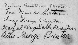 na Elizabeth (1893-1893), Nina Beatrice (1894-1921), Myrtle Margaret (1896-1914), Vera Elizabeth (b 1898), Eva Maude (1900-1952), Richard Irving (b 1904), George Otis (1907-1981), Inez Irene (1908-1991) and Hazel Elizabeth (b 1912). The Preston family likely moved to Saskatoon, Saskatchewan in about 1906 as George was born there in 1907. In 1911, the family was enumerated at 308 3rd Ave in Saskatoon. Richard Sr died on 21 July 1915 in Saskatoon.