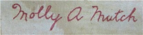 Mary and Susan Mae were the only possibilities that we could locate for the Molly Mutch and S W Peterkin signatures on the quilt. As Molly is a common nick name for Mary we speculated that Mary may have signed her name Molly. However, we could find no documentation to suggest that she ever used the nick name Molly. We cannot explain the middle initial W for the S W Peterkin signature. It is possible that Mae wrote her name on a piece of paper and asked someone else to write it on the quilt for her. Perhaps they mistook the M for a W.
