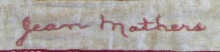The quilt clearly has Jean Mathers as the signature and the family discussed above spells their name Mather in every official document and on every tombstone. It is possible that the correct signer has not been identified. If we have found the correct Jean, she likely told some one to write her name on the quilt for her and they spelled it wrong. We could find no other candidate for this signature.