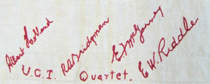 Four men whose names are on the quilt were members of the UCT Quartet. EFL McGarvey was a music tutor and this may have been a ‘barber-shop’ quartet. UCT is the United Commercial Travelers of America.