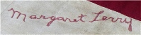 In 1915, George married Margaret Katherine (Maggie) Rutherford. She was born on 14 January 1885 in Bruce, Ontario to David A Rutherford (b 1861) and Katherine (Katie) Gillies (b 1866). Her siblings were: Agnes Gillies (1886-1940), Millie Robena (Mildred) (b 1890), William James (b 1891), Robert Ernest (b 1896) and David Stewart (b 1900). In 1891, the Rutherford family was living in Eastnor, Ontario and in 1901, St Edmunds, Ontario. In 1911 Maggie and her sister, Mildred, were living at 211 4th Ave in Saskatoon. George and Maggie joined 3rd Ave Methodist Church in 1915 and remained members until they died. In 1916, the couple was living in the Connaught Block, 247 3rd Ave S and George was a salesman of dry goods. All efforts to find them in the 1921 census failed. As only brothers and sisters were mentioned in their obituaries, it can be presumed that they had no children. George died on 27 March 1952 and Maggie on 10 November 1953. Both died in Saskatoon and were buried in Woodlawn Cemetery. Bessie H Clarke who signed the same area of the quilt at the Terrys has the surname Terry in her ancestry. As the name Terry seemed to be fairly rare and relatives often signed near each other, it was speculated that the Terrys may have been related to Bessie. However, if there was a connection, it could not be discovered.