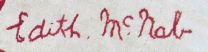 Edith married Archibald Peter (Archie) McNab on 20 April 1892 in Winchester RM, Manitoba. Archibald was a twin to Neil. They were born to Malcolm McNab (1819-1890) and Catherine (Kate) McCrimmon (1829-1869) on 29 May 1864 in Lochiel, Glengarry, Ontario. Other siblings were: Margaret (Maggie) (1857-1947), Christina A (Christy) (b 1860), John Duncan (1861-1903) and Daniel Donald (b 1865). They also had two half siblings from their father's first marriage to Margaret Cameron (b 1822): Alexander Colin (1851-1931) and Catherine (b 1853). Archie was raised in Lochiel. In 1882 he and Neil moved to Winnipeg and worked there for a while until they moved to land near Virden, Manitoba to claim homesteads.