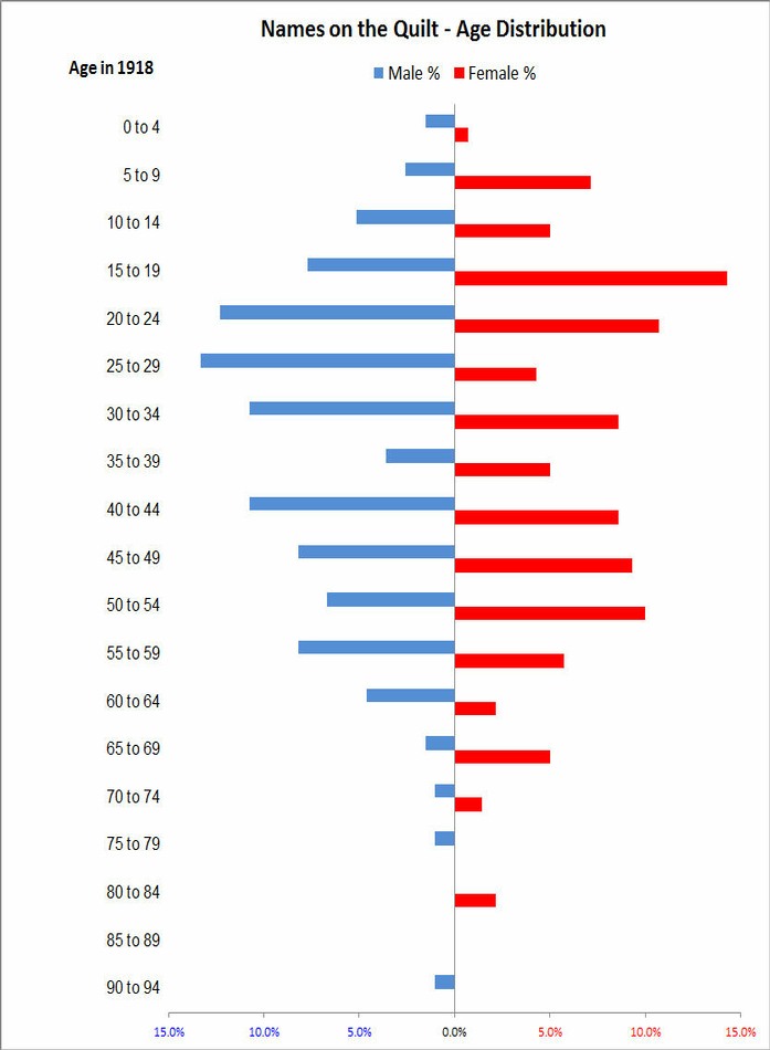 Rather less than 60% of those named on the quilt are males. There is a shortfall of males in the 35-39 age bracket and a excess of females in the 15-19 age bracket.