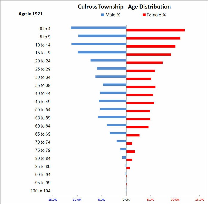 Five years after the quilt was made, the regular census was taken across Canada. We have analysed the age distribution for those living in the Culross Township from this census data.